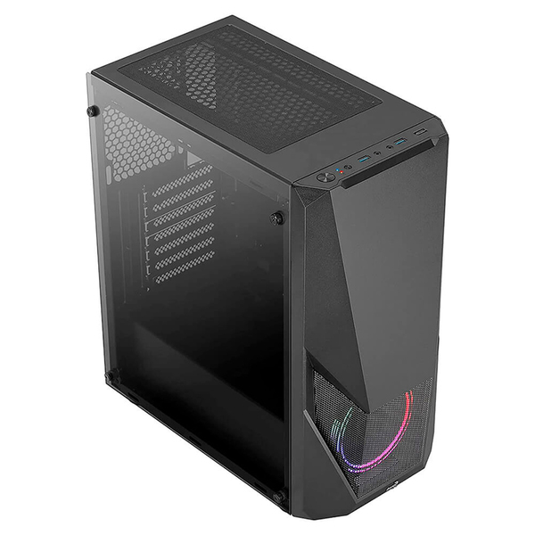 Semitorre de alto rendimiento con panel frontal de corte futurista para potenciar la estética de tu setup. Panel frontal con diseño de rejilla para una mayor ventilación y una mejor visualización del ventilador LED frontal. Equipada con un ventilador de 12cm Fixed RGB (Saturn 12 FRGB) en el frontal de la caja. Panel lateral total de cristal templado para mostrar el interior de tu rig.