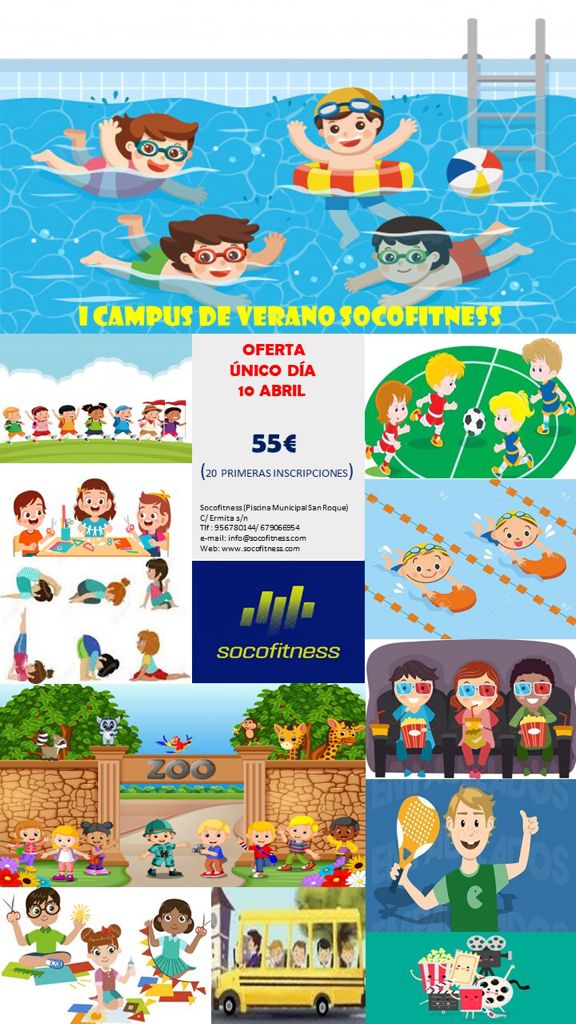 Actividades para niños y niñas de entre 3 y 16 años. Incluyen natación en piscina, pádel, fútbol, juegos populares, baloncesto, manualidades, voleibol, baile y fitness. Actividades niveladas y por grupos de edad.